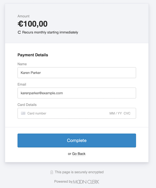 Here’s how 3D Secure will work. If SCA applies to a European payer, they’ll first go through the normal MoonClerk checkout process: