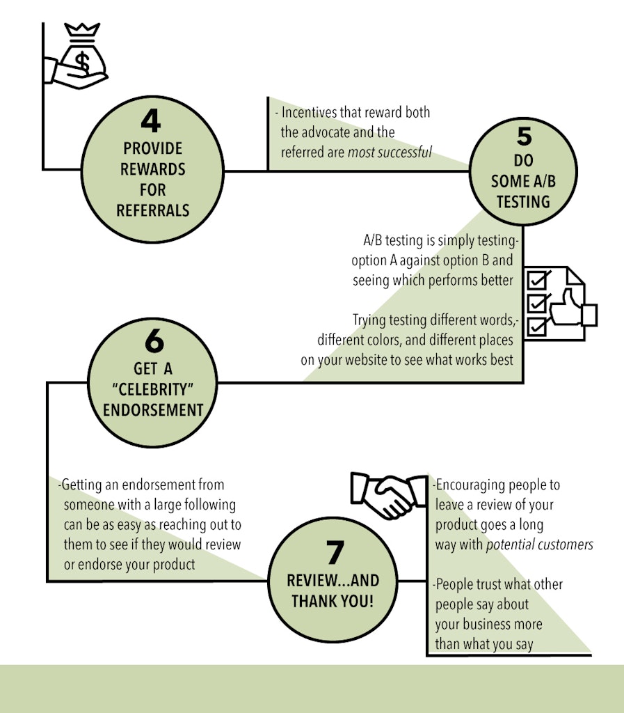 Setting up a program for your customers that rewards them when they refer another person will give them the push they need to send people your way. Incentives that reward both the advocate and the referred are most successful.